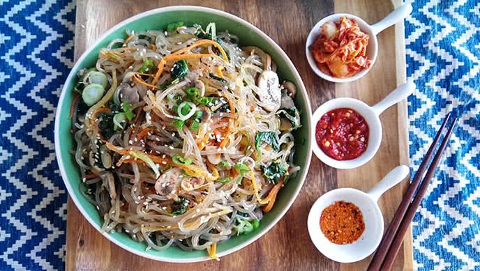 In simple terms, japchae is a type of mixed glass noodles. However, this mixed noodle dish itself will have several ingredients to create its own distinctive features such as: beef, mung beans, sesame seeds, sesame oil, shiitake mushrooms... Japchae often has a light brown color from sesame oil, harmoniously combined with the red color of carrots, reddish-brown of beef and earthy brown of shiitake mushrooms.
