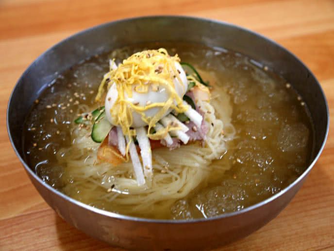 Naengmyeon-bibim features chewy noodles made from potatoes or sweet potato starch. Naengmyeon-mul, on the other hand, is made from buckwheat flour. The accompanying ingredients include thinly sliced beef or pork, Korean radish, boiled eggs, cucumbers, and optional mustard or vinegar according to taste preferences. The cold broth used to be traditionally made from boiled chicken, later replaced with meat and bones from other animals.