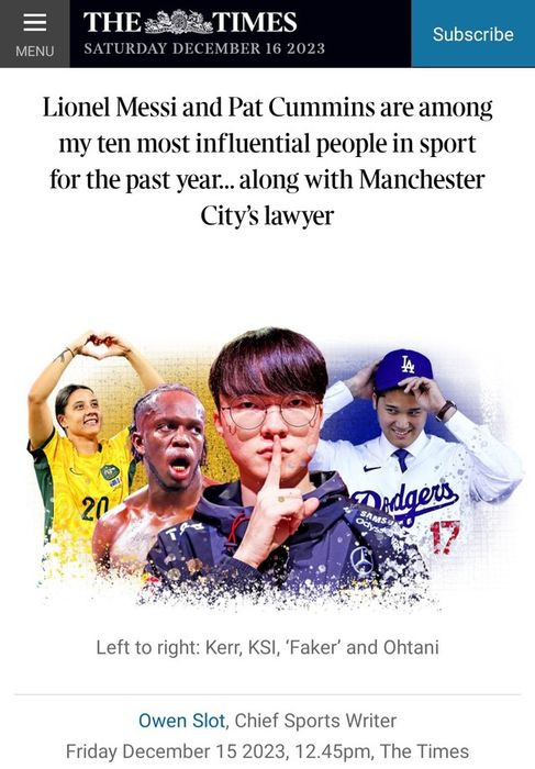 Recently, Faker achieved yet another honor previously unprecedented in the history of League of Legends or Esports in general. Specifically, The Times, a prestigious and longstanding newspaper in the UK, dubbed Faker the 'Unkillable Demon King' and ranked him among the Top 10 most influential figures in sports in 2023. Alongside Faker were renowned figures from mainstream sports such as Lionel Messi and Shohei Ohtani, the baseball player who recently signed a record-breaking $700 million contract.