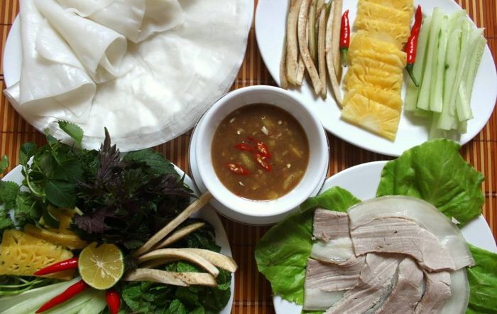 Pork rolled in rice paper is a specialty here, with thin slices of pork rolled in rice paper along with various raw vegetables like lettuce, starfruit, or sour mango, served with typical Da Nang fish sauce or special dipping sauce.