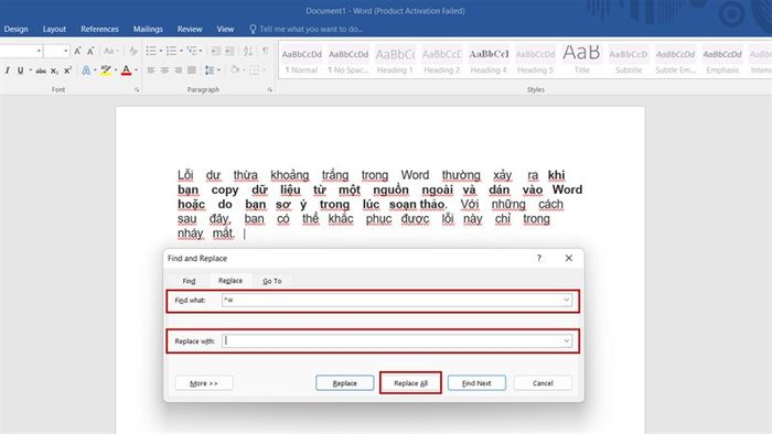 Step 3: Immediately, the Find and Replace dialog box appears > In the Find what box, type ^w and in the Replace with box, type a single space then press Replace All.