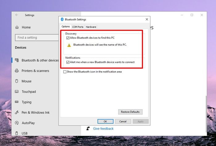 Allow Bluetooth devices to find this PCand the mode