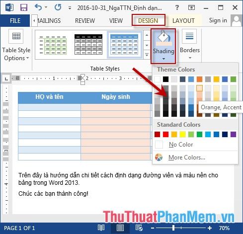 Step 1: Choose the data range in the table for the background color -> Design -> Shading -> select the desired background color (or click More Color to explore other colors):
