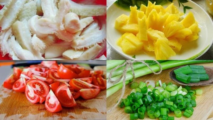 Continue preparing other ingredients, such as trimming and thinly slicing the pickled mustard greens. Peel and slice the pineapple. Clean the tomato and cut it into wedges. Wash herbs like scallions, coriander, and culantro, then chop them into small pieces. Peel and mince garlic and dry shallots.