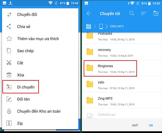 Download File Commander -> Open the app -> Internal Storage -> Select Zing MP3 folder -> Move the downloaded song to Ringtones folder.