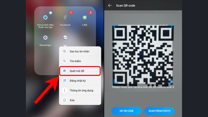 Step 1: First, tap and hold on the Zalo icon outside the main screen => Choose Scan QR code => Then, bring the QR code in front of the camera and start scanning.