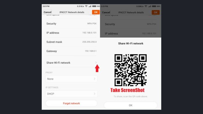 Step 1: Access the Settings menu => Select Wifi => Choose the connected Wifi to get the QR code.