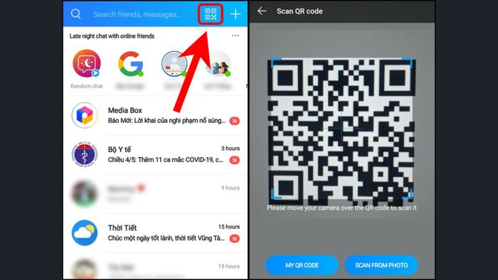 Step 1: Directly access the Zalo app => Tap on the QR code icon at the top right corner of the screen => Then, bring the QR code in front of the camera and start scanning.