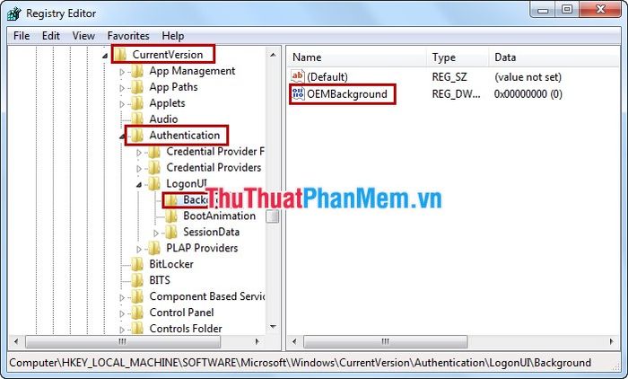 - In the Registry Editor interface, locate the OEMBackground keyword following this path: HKEY_LOCAL_MACHINE\SOFTWARE\Microsoft\Windows\CurrentVersion\Authentication\LogonUI\Background.
