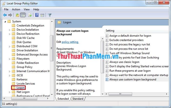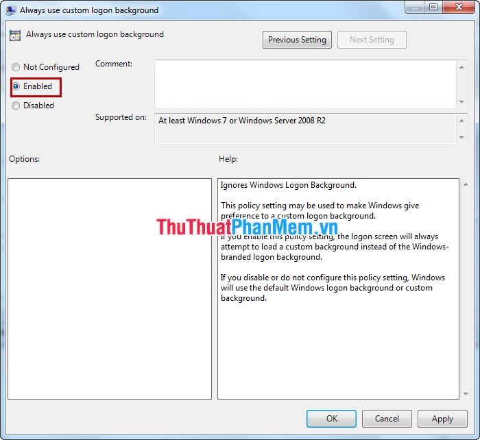 - Double-click on Always use custom logon background, set the mode to Enabled, click Apply, and then OK.