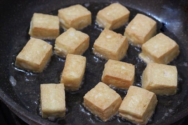 – Heat a pan with cooking oil, then fry each piece of tofu until golden brown on all sides. Fry over low heat.