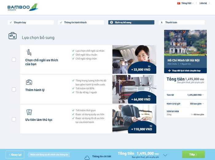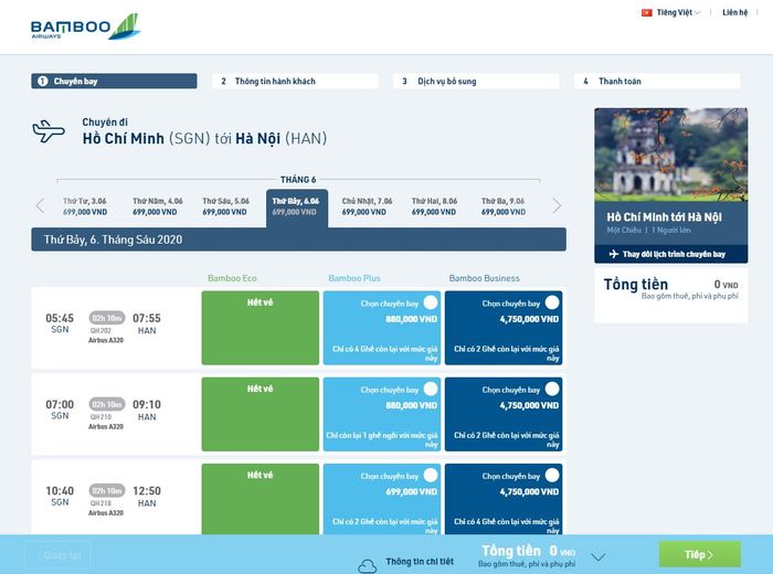 At this time, the system will display 3 - 4 ticket classes depending on the route: Bamboo Eco (economy class), Bamboo Plus (flexible economy class), Bamboo Business (business class), Bamboo First (first class) as well as the departure time of each flight for you to easily choose. You should prioritize choosing Eco class tickets as this is the cheapest class of tickets offered by the airline. If Eco tickets are sold out, then choose Plus class. Avoid choosing Business class tickets as this is a very expensive business class, not a good choice for those looking for 'cheap flight tickets'.