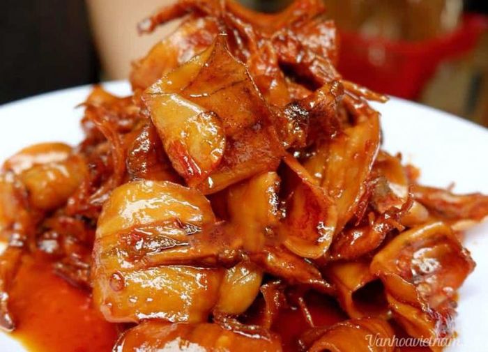 Looking at each piece of squid ink, you will see an enticing reddish-brown color, an effect of careful spice marination. When you place the squid ink on your tongue, the sour taste of tamarind juice combined with a hint of mild chili and the salty flavor of the sea create a unique and unforgettable taste experience. The delicate combination of these ingredients creates a special flavor, a refined expression of Da Nang's culinary identity.