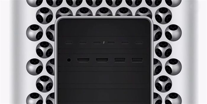 Mac Pro M2 Ultra features numerous ventilation holes for heat dissipation. Source: CNET.Mac Pro M2 Ultra comes equipped with a multitude of accompanying connectivity ports, making it easy for users to set up with various peripherals such as Mac Pro Display, projectors, etc. This connectivity port system includes 6 USB-C ports (Thunderbolt 4), 2 LAN ports, 1 standard 3.5mm audio port, 2 USB-A ports, and 2 HDMI ports.