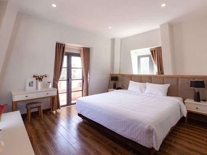 The hotel has received many high ratings from customers with a high rating score (4.7/5 stars on Google). The accommodation here is designed in a modern style with wooden furniture and fully equipped. In front of the hotel entrance is a large courtyard with outdoor seating, perfect for BBQ parties, and behind it is the scenery of houses with classic French architecture adorned by the greenery of extremely peaceful trees.