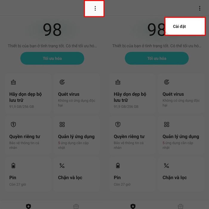Step 1: Your OPPO Reno8 Pro 5G comes with a default app called iManager, which is tasked with system management and optimization. To perform automatic memory clearance, open this app, then tap on the three dots at the top right corner of the screen > Settings.