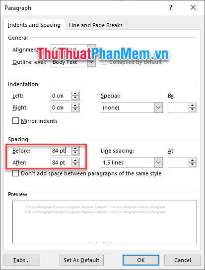 The Paragraph function window appears, adjust the Before and After parameters in the Spacing section to change the line spacing. Where Before is the spacing of the selected line with the line above (top space) and After is the spacing of the selected line with the line below (bottom space).