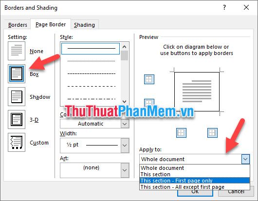 Click on Box in the Setting section to choose to create a border for the entire page, then change Apply to to This section - First page only to only create a border for the first page.