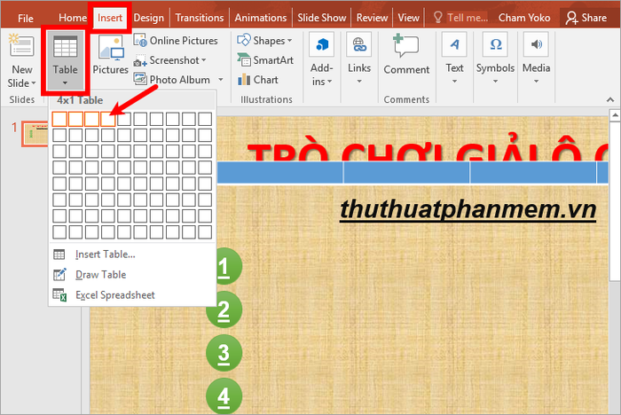 Step 5: Choose Insert -> Table -> select the corresponding number of cells for the answer to question 1 (for example, if the answer to question 1 is Game, select 4 columns and 1 row to create a table).