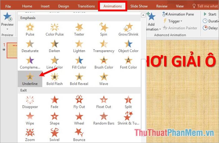 Next, create effects for the text by selecting the Animation tab and choosing the Underline command (or any effect you prefer in the yellow Emphasis section).