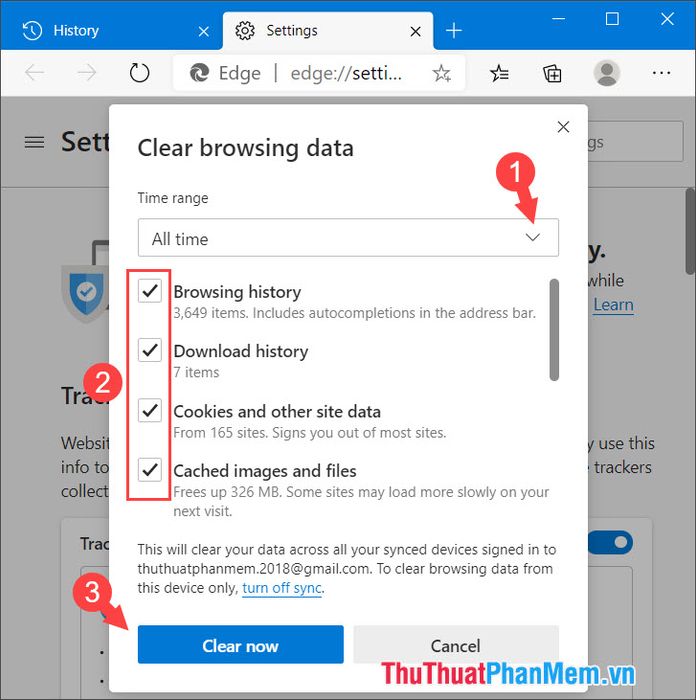 Step 2: In the Time range section, select All time (1) to delete all history. Then, check all items (2) to clear all browsing data and sensitive data stored such as accounts, passwords, cookies. Finally, click Clear now (3) to initiate the deletion process.