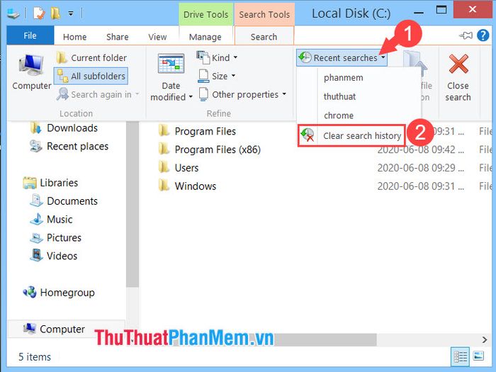 Step 2: Click on the Recent searches (1) section => Clear search history (2).