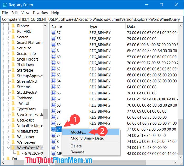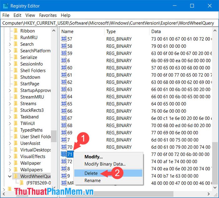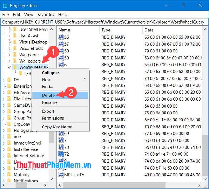 Step 4: To clear your entire search history, right-click on WordWheelQuery (1) => Delete (2).