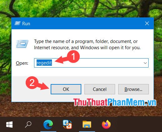 Step 1: Press Windows + R to open the Run dialog. Then, search for regedit (1) => OK (2).