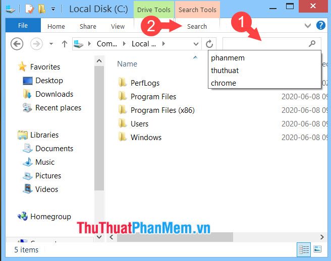 Step 1: Click on the search box (1) and menu Search (2).