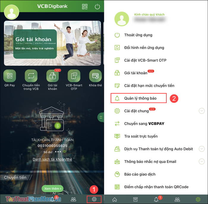 Step 3: Select the Settings (1) option and choose Notification Management (2) to access account notification settings.