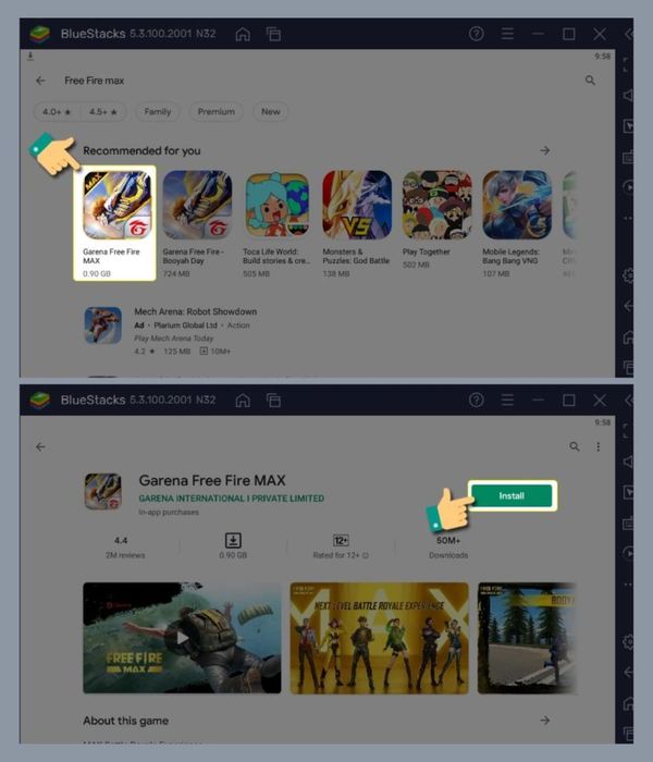 - Step 1: Open Bluestacks => Select Play Store => Search for Free Fire Max => Tap on the game icon => Tap Install.