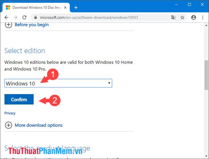 Step 3: After switching to a different User agent, the options to download the Windows ISO will appear. Choose the Windows 10 edition according to your preference and click Confirm.