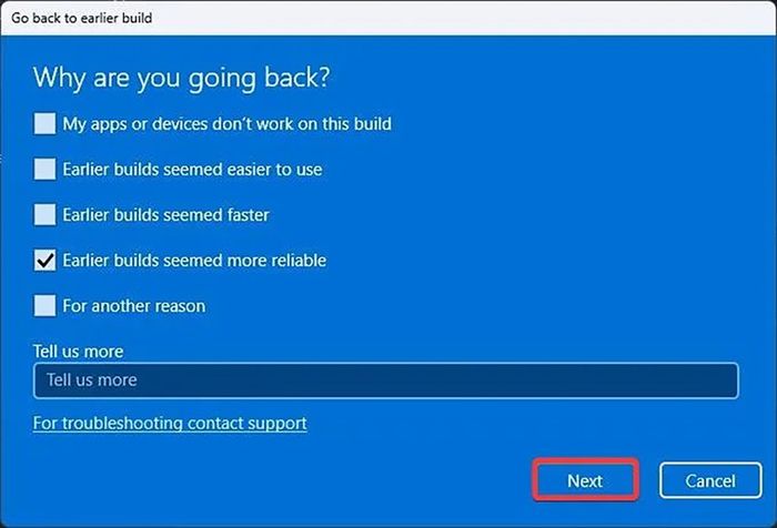 Step 3: Immediately, the system will present questions about why you want to revert to the previous Windows version > Tick the reason and press Next.