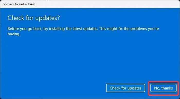 Step 4: The next screen will prompt you to check for updates. If available, you can install it to fix any issues you're experiencing. If not needed, you can click No, thanks and the system will automatically downgrade for you.