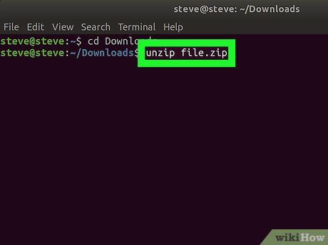 - If the ZIP file is within a folder named 'ZIP' inside the 'Downloads' directory, you would type cd /home/name/Downloads/ZIP (where name represents your username).