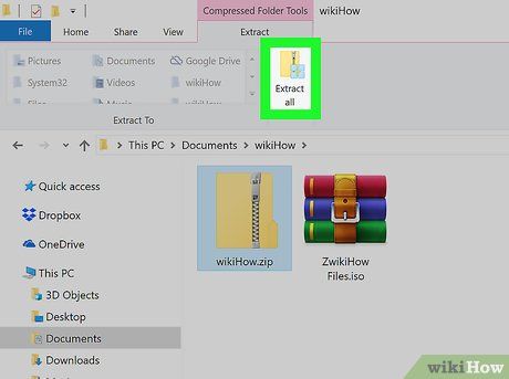 Click on Extract all. This is represented by the icon resembling a folder with a zipper and four blue squares near the top of the window.
