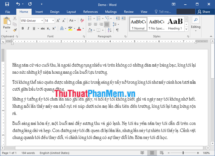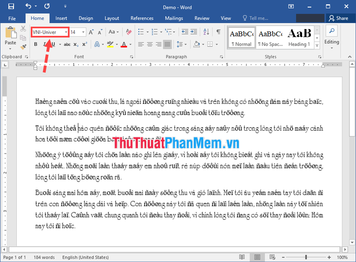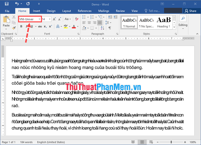 Step 1: Check the name of the original font the document is using to identify the encoding. In the example below, the font is VNI-Univer, which corresponds to the VNI Windows encoding.