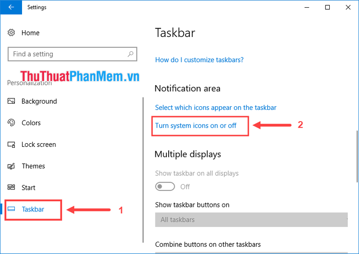 Step 2: Click on Taskbar in the left menu, then scroll down and select Turn system icons on or off.