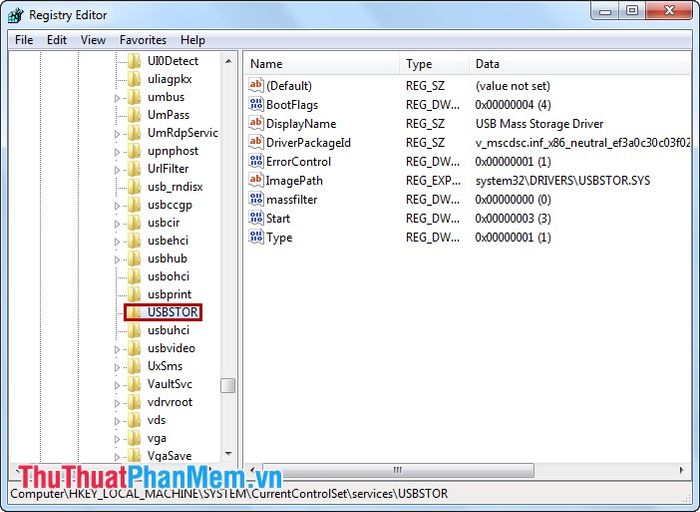 Step 3: Navigate to the keyword USBSTOR. Follow the path: HKEY_LOCAL_MACHINE\SYSTEM\CurrentControlSet\services\USBSTOR.