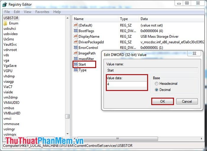 Step 4: Right-click on Start, in the Value data, enter the number 4, then click OK.