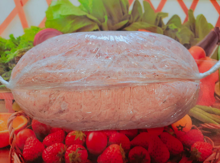 - After grinding the meat, place it in the center of a leaf, spread the meat evenly, and grasp both edges of the leaf, roll the sausage into the center, temporarily secure it with a string.