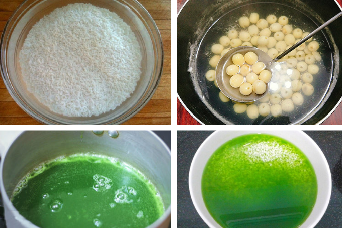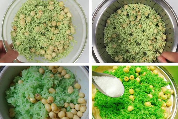 - Rinse glutinous rice thoroughly and soak it in the pandan water for 6 - 8 hours until the rice becomes soft and evenly swollen.