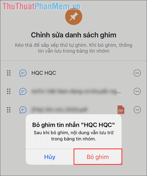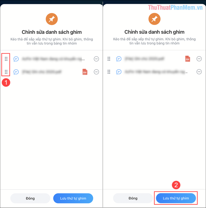Step 5: Additionally, you can also click on Move (1) to change the order of pinned messages. The top message will be displayed outside the main screen. Once you've finished rearranging, click Save pin order (2) to complete.