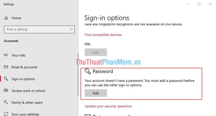 Step 2: Select 'Sign in Options', locate the 'Password' section and click 'Add'