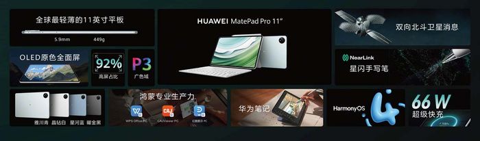 Specifications of Huawei MatePad Pro 11 (2024)The battery has a capacity of 8300mAh and supports fast charging at 66W. The tablet supports two-way messaging via satellite when unable to connect to a mobile network.