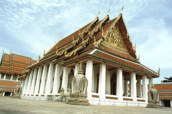 Built during the reign of King Rama III, Wat Prayoon or Wat Rua Lek is located on Thonburi Road just under the Memorial Bridge (Saphan Phut) near the former Portuguese community and on the tranquil western bank of the Chao Phraya River in the heart of Bangkok, Thailand, becoming an attractive destination for tourists. From a distance, you'll be impressed by the giant white bell-shaped Phra Maha Chedi Boromthat (Great Chedi), towering at 80m, surrounded by a colonnade and 18 other satellite stupas.