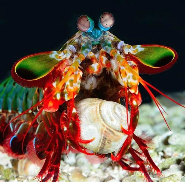 The entire body of the shrimp is protected by a hard chitinous shell, with the carapace at the cephalothorax, often thicker and harder than other parts. The carapace usually encases the gills and most of the internal organs. Water is regularly pumped through the gills by the movement of mouth appendages. A sharp and rigid rostrum, possibly with multiple sharp spines, protrudes from the front of the carapace, called a rostrum, used for offense or defense and can help the shrimp maintain balance when swimming backward. Two protruding eyes on either side of the rostrum. They are compound eyes with panoramic vision and the ability to detect movement well; however, some blind shrimp species have adapted to their burrowed mud-dwelling environment.