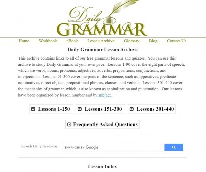 The lessons designed on Daily Grammar are presented logically and scientifically. That means topics for beginners start from lesson number 1 and gradually increase in difficulty up to lesson 300, the highest advanced lesson on the website. Lessons from 300 to 440 focus on punctuation. The website is user-friendly and entirely dependent on you; you learn at your own pace through engaging in activities. Each lesson here starts with a brief explanation of the topic, followed by various related questions.