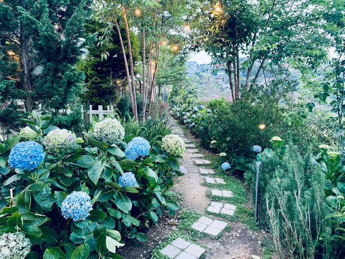 Right from the entrance, a patch of lavender and herbs is interspersed to create an impressive check-in spot for the cafe. Upon entering, a small path emerges, flanked by clusters of red willow intertwined with lavender and fragrant pines. On the other side, a row of hydrangeas is blooming in various shades of purple, white, and dreamy blue. A small fence adorned with pink bougainvillea adds a vibrant touch to the garden. Above, the charming maple branches interlace, providing shade for the outdoor space of the cafe. Everything blends together to form a lush green garden, a cool retreat for travelers escaping the scorching summer sun in Dalat.