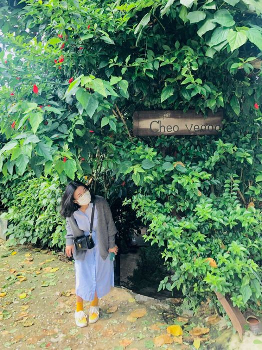 The highlight of Cheo Veo is the entrance to the cafe, featuring a uniquely cool green canopy. The canopy is entirely made of the trunk and leaves of a bougainvillea intertwined with vines. What makes it even more special is that this natural canopy doesn't lie flat but tilts down the slope towards the cafe. This is also a uniquely quirky spot for a check-in, only found at Cheo Veo.